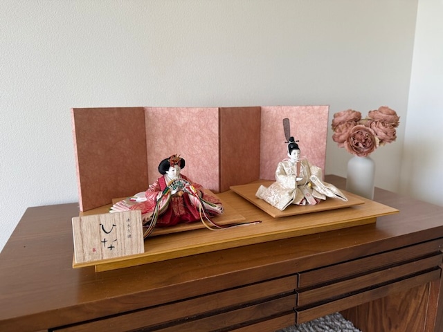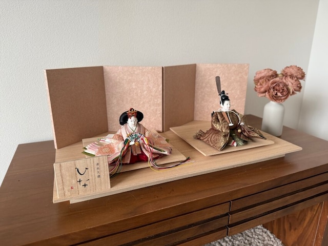 サイズ:60×33×24 親王:芥子 清水久遊 正絹-古代 屏風:7号 和紙屏風 雲母 ペールピンク 飾台:20号 タモ ツヤなし 付属品:お手入れ用毛ハタキ、手袋