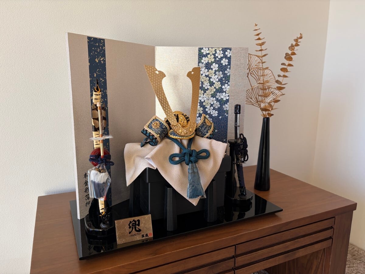 台屏風:黒塗低床台 麻柄帯桜